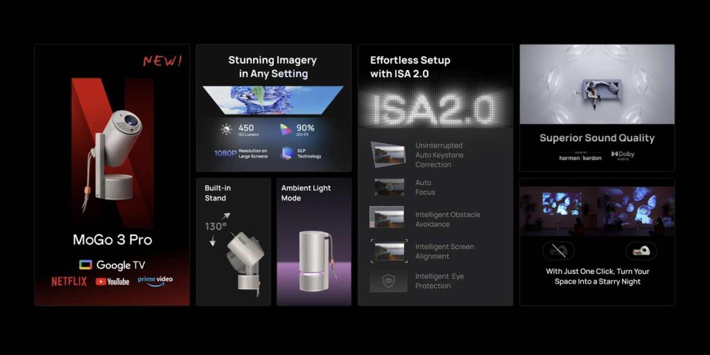 The MoGo 3 Pro provides a 1080p image across a wide space and can essentially be pointed anywhere. Unlike previous years’ products, it runs Google TV and has native Netflix compatibility. Users can grab an additional tripod and carrying case if they want to go the extra mile and bring this projector everywhere. It isn’t so out of the realm of possibilities.