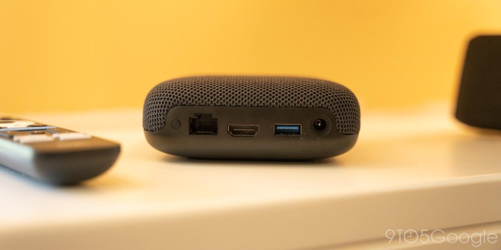 Walmart Onn Pro, meanwhile, has a thicker, but smaller overall design. It has fabric up top to hide the built-in speaker and microphones which can be used for “Hey Google” commands similar to a Nest smart speaker. Around back, there are four ports – Ethernet, HDMI, full-size USB-A, and a barrel plug for power.