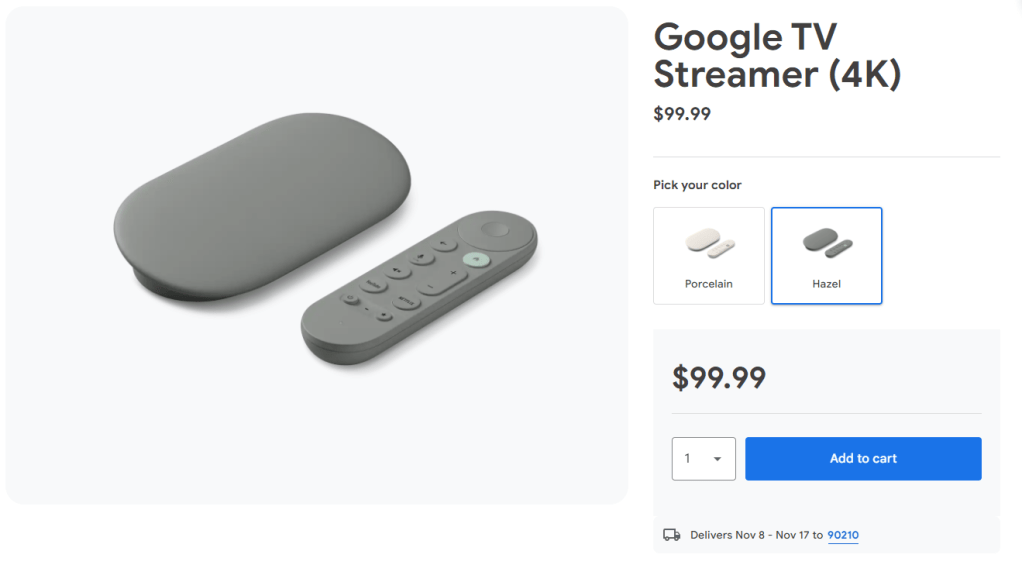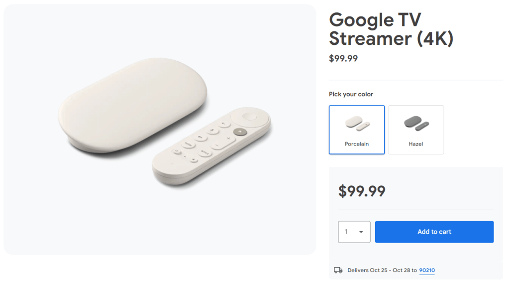 If you head to the Google Store to pick up the new Google TV Streamer, you’ll be waiting through the end of October for delivery. We’re seeing the standard “Porcelain” color at an estimate of October 24-25 for our delivery address in North Carolina, though those dates may vary slightly in other parts of the US. For instance, to Beverly Hills’ iconic zip code, the shipping dates for “Porcelain” are a bit later.