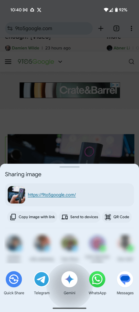 Through our quick tests this morning, we’ve noticed that content is shared to the full Gemini app, which pops up when you share the image. Somewhat frustratingly, it doesn’t work in the overlay interface, which would be more convenient from the perspective of not forcing users to leave their current app.