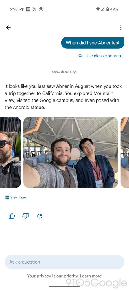 As for the functionality itself, we’ve noticed that Ask Photos, in our limited testing so far, is best at answering questions that are about people and places, not about events or things.