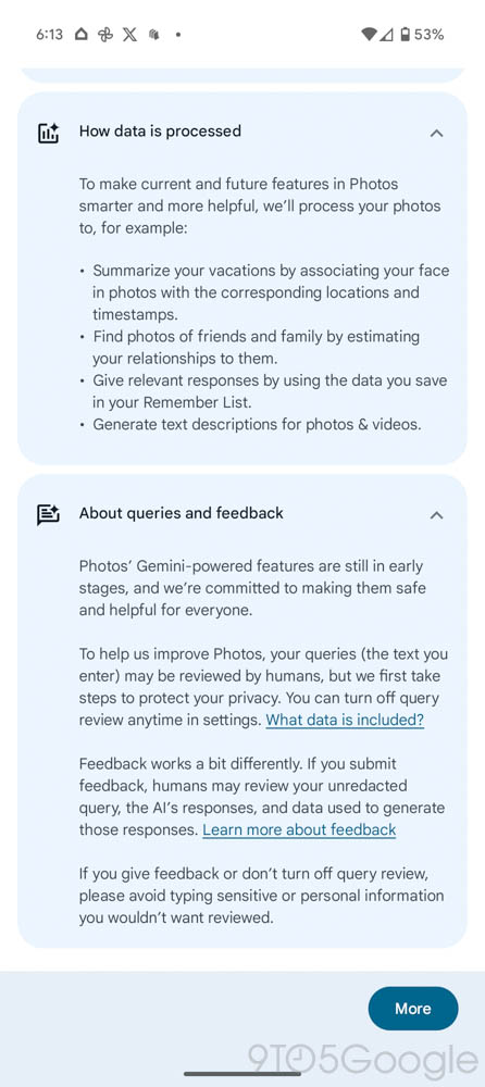 In what appears to be a server-side update for users in the US, as Google previously announced, “Ask Photos” is appearing in the Google Photos app. The AI-powered feature allows for natural-language interactions with your photo library that can include more complex prompts such as asking for Halloween costumes over the years, when your child learned to swim, and more.