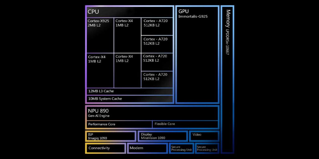 The Dimensity 9400 is made up of 1 Cortex-X925, 3 Cortex-X4 cores, and 4 Cortex-A720 cores. This all-Cortex makeup is packed into a chipset built on a 3nm process – an upgrade from the 4nm 9300. The powerhouse X925 takes up a similar slot to the three additional X4 cores, with the A720 blocks lining up beside them. This build is slightly different than the chipset that came before it. The A720 is the least powerful core in this chip, whereas the Dimensity 9300 brought A520 cores to the party.