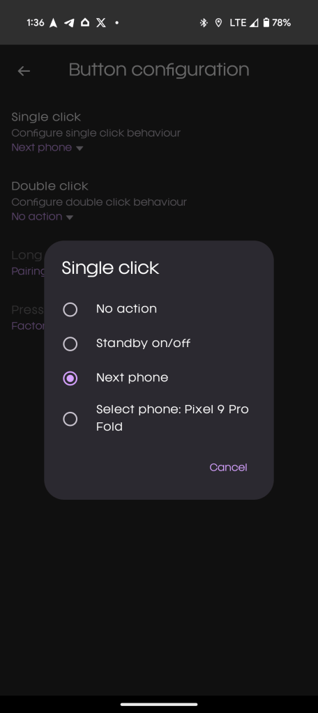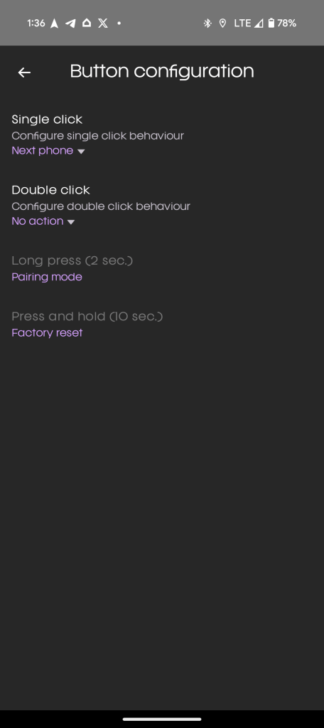 More impactful is the addition of a button on the device. This button can be used to switch between paired smartphones, as well as to “pause” the connection. You can also use it to default back to a specific paired device, or start pairing. This is a great quality-of-life change, as it makes it much easier to connect to a new device, or switch between who’s phone is paired, which is of course helpful in a shared vehicle, or if you have more than one device. The actions on this button are also mappable in the app, with press, double-press, and long-press actions being re-mappable.