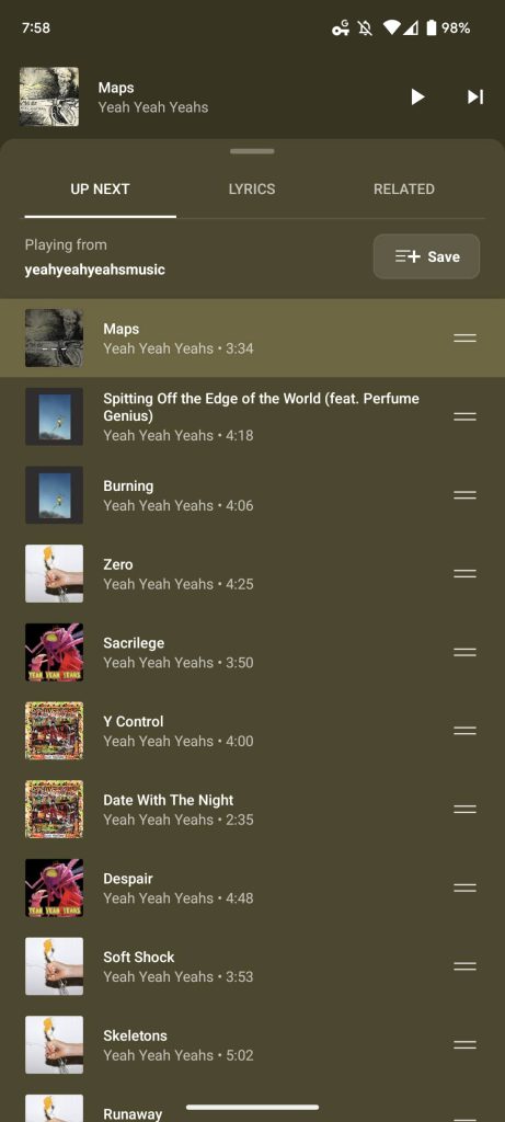 The cover art and the album/collection name is in the same place, while the button placement for saving to library/starring, downloading, and even the three dot menu is identical. Then there’s the pill-shaped “Play” and “Shuffle” buttons just below that.