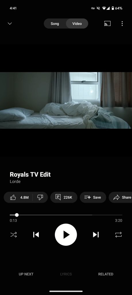 The Now Playing screen has the same play/pause and next/last arrangement flanked by shuffle and repeat in identical positions, while the red progress bar is above it. The queue button is different, but is also located in the bottom-left corner position like “Up next.” Since Nintendo Music shows rectangular cover art, it looks a lot like the video player in YouTube Music.