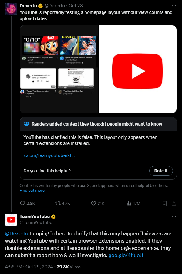 Rather, the official @TeamYouTube account on Twitter/X responded to the viral tweet which had racked up over 17 million views saying that this layout may happen “if viewers are watching YouTube with certain browser extensions enabled” and encouraged users to report the behavior if they saw it without browser extensions enabled.