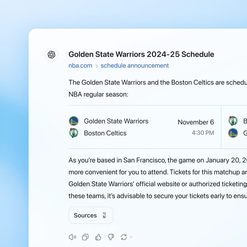 Alongside general answers and web links, ChatGPT will also be able to surface weather (powered by AccuWeather), stocks, sports scores, news, and maps. News content, ChatGPT says, comes following the company has “collaborated extensively with the news industry and carefully listened to feedback.”