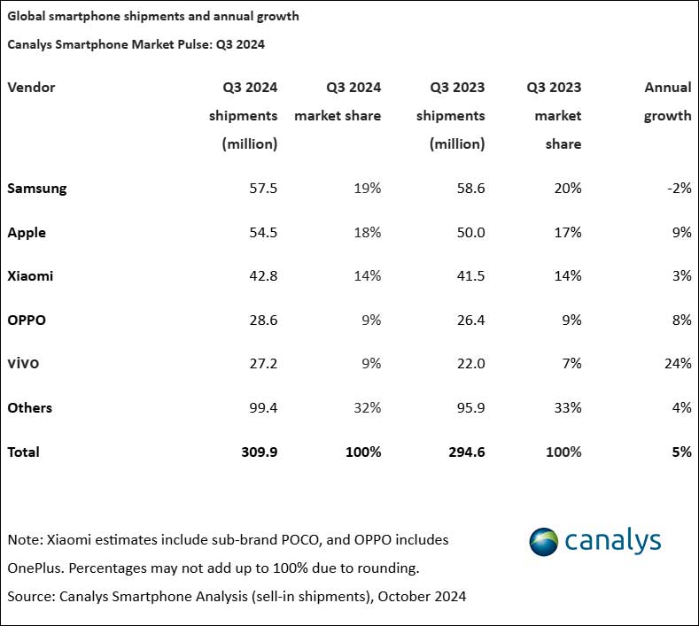 According to a report by Canalys, global Q3 2024 shipments increased by 5% compared to the same quarter in the previous year. Samsung saw a decrease in shipments by 2% in 2024, which still equates to 57.5 million shipments in Q3, beating Apple and it’s slightly lower 54.5 million shipments. Apple’s shipments rose by 9%, closing the gap between the two companies on the back of the iPhone 16 launch.