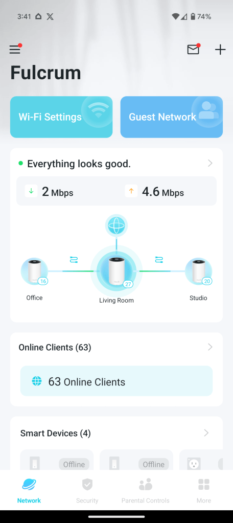 TP-Link’s Deco app isn’t quite as nice as the Home app, but it’s very well done as a result of being focused specifically on Wi-Fi. The app opens to show you you current network status front and center, including a live look at network activity, while listing your connected clients below and even being able to split out select smart home devices from TP-Link’s other lineups. I found that the last bit there was pretty unreliable, though, constantly reporting my switches to be offline even though they weren’t. At the top you’ll also quickly be able to access Wi-Fi settings and your Guest Network, while tabs at the bottom provide access to some security options, parental controls, and deeper settings. It’s all very well done, and my favorite part by far is the ability to just search for the feature or function you need. Instead of digging through menus while you’re trying to follow a tutorial, you can just search for it, a huge win in my book! There are still things I think Google did better, such as making it way more obvious where to perform a speed test, but the Deco app is a great experience.
