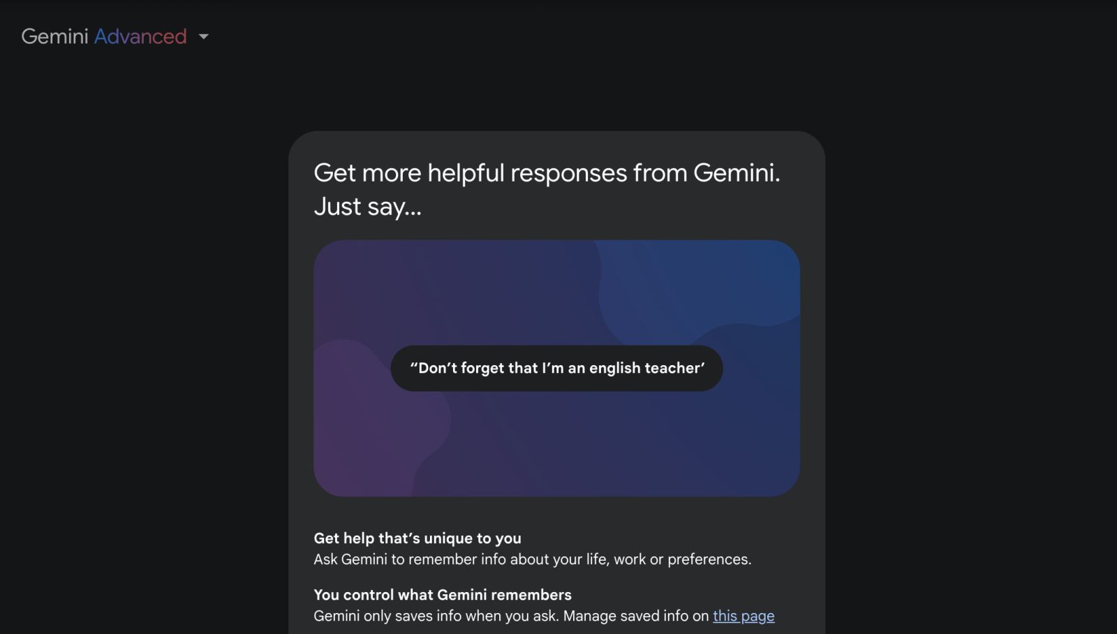 You can have Gemini remember things about your work, your hobbies, or your general aspirations in life,” with Google framing as “giving Gemini a user manual, designed by you.” Doing so can result in “more consistent, predictable results without repeating the same details.” It’s similar in concept to Gems, but applied to the entire Gemini experience.