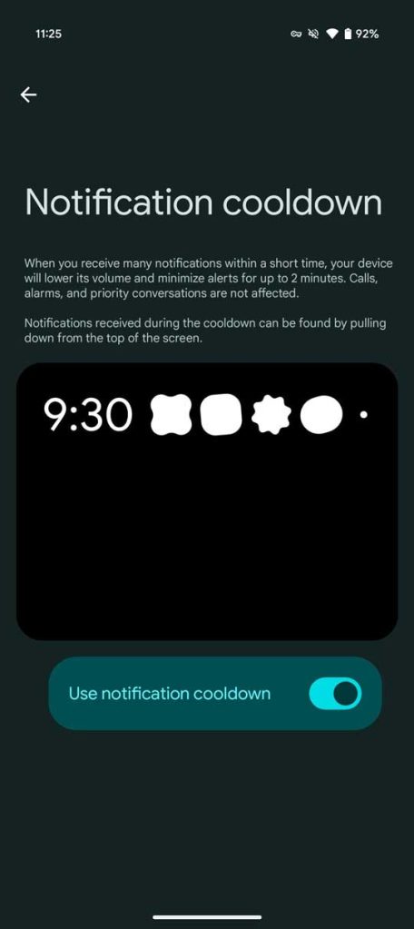 Notification cooldown can be found under Settings > Notifications in the General section. It finds itself next to other useful tools like notifications snoozing. In effect, notification cooldown will count the number of notifications you receive in any two short periods. If the number of alerts is over the threshold set, which can not currently be changed, your Pixel phone will “lower its volume and minimize alerts for up to 2 minutes.” The feature looks to be on by default in the Developer Preview.