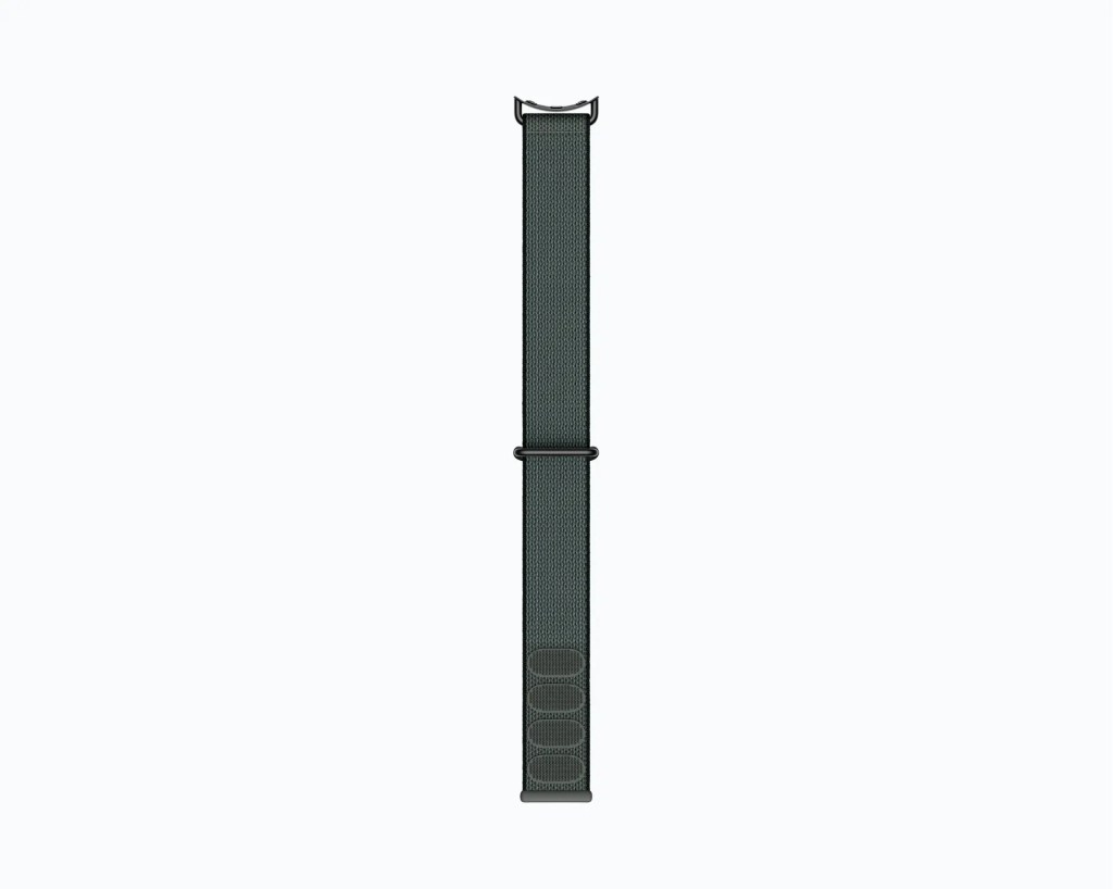 The Performance Loop Band is made of “recycled polyester, nylon, and elastane yarns” with stainless steel lugs. It is “micro-adjustable” (velcro) with “just the right amount of stretch during workouts.” The water resistance is listed as “Workout-friendly.”