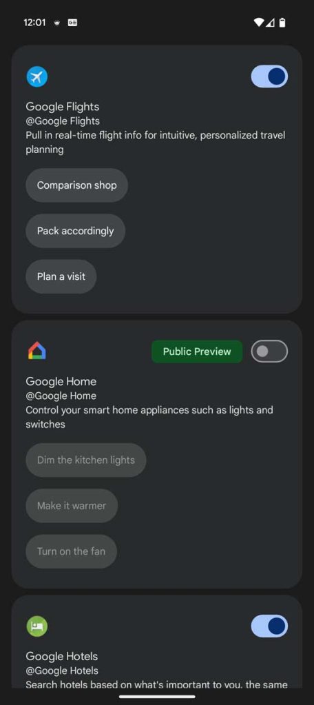 By default, there are some extensions that may be enabled in the Gemini app. On top of that, there are also some extensions that are available for some and not on certain devices. During the rollout period for new extensions, you may find that some extensions are not available. As they become available, they’ll apepar in the Gemini app settings.
