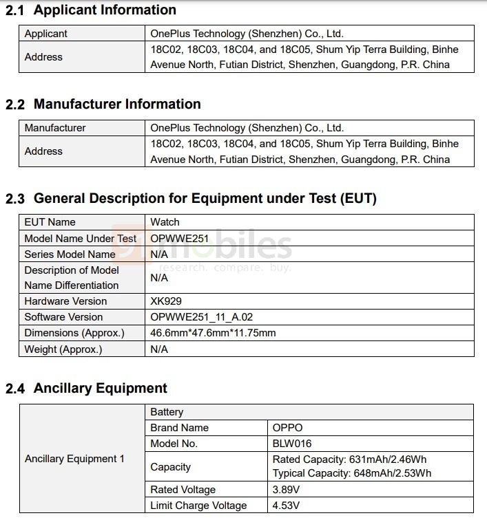 The listing also reveals the potential battery size as being around 631-648 mAh. Those are “rated” and “typical” capacity amounts, but in either case it’s a considerable jump over the 500 mAh battery found in OnePlus Watch 2.
