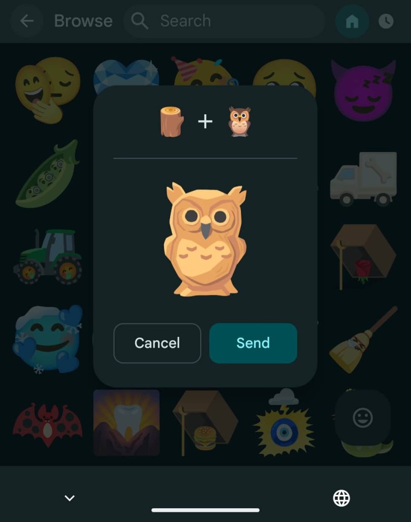 Meanwhile, an arrow at the left (instead of a settings gear) takes you to a new “Browse” screen that shows all combinations. If you tap the emoji FAB (floating action button) in the bottom-right corner, you get a picker that lets you set an emoji and see all the possible combinations using that base.
