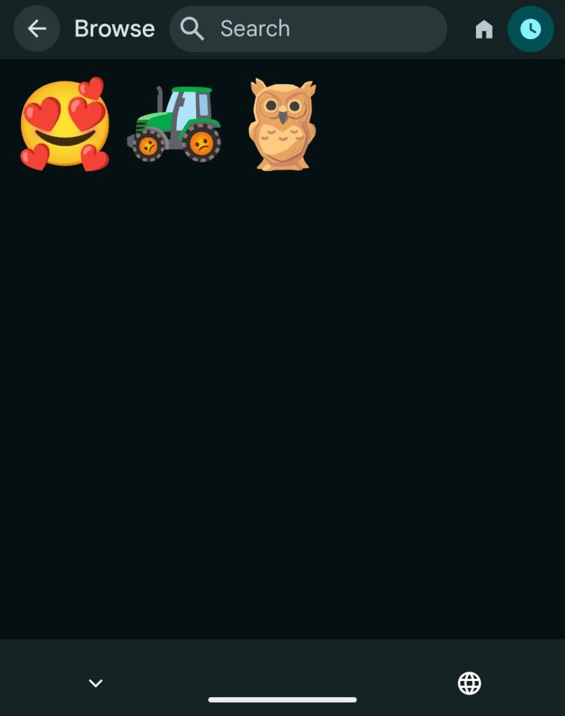 Meanwhile, an arrow at the left (instead of a settings gear) takes you to a new “Browse” screen that shows all combinations. If you tap the emoji FAB (floating action button) in the bottom-right corner, you get a picker that lets you set an emoji and see all the possible combinations using that base.