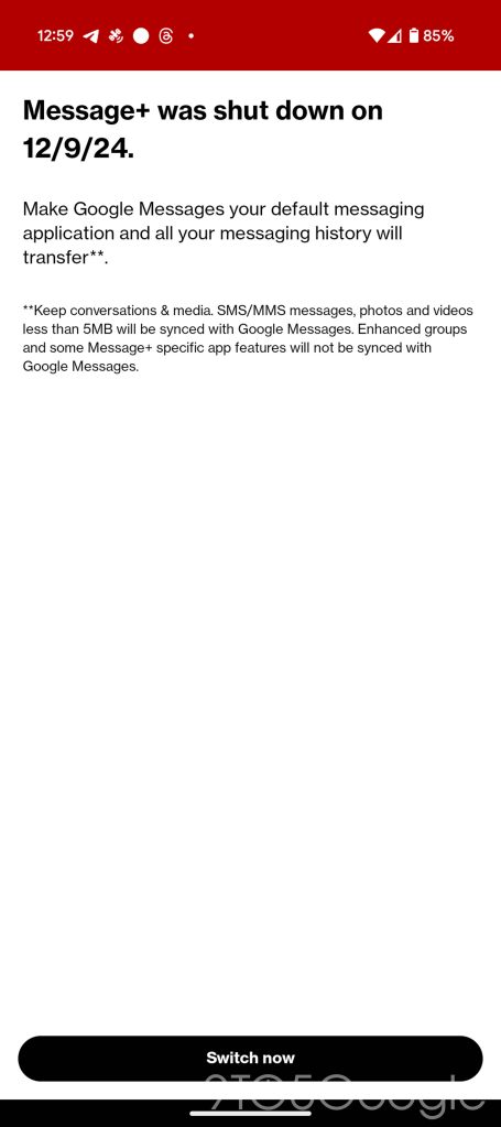 We tested this, and the app does have a full screen pop-up that tells users the app was shut down on December 9, and prevents all access to existing messages. The pop-up tells users to switch to Google Messages and that “all your messaging history will transfer.” A “Switch now” button at the bottom of the screen opens Google Messages (if it is installed) which prompts users to switch their default SMS app.