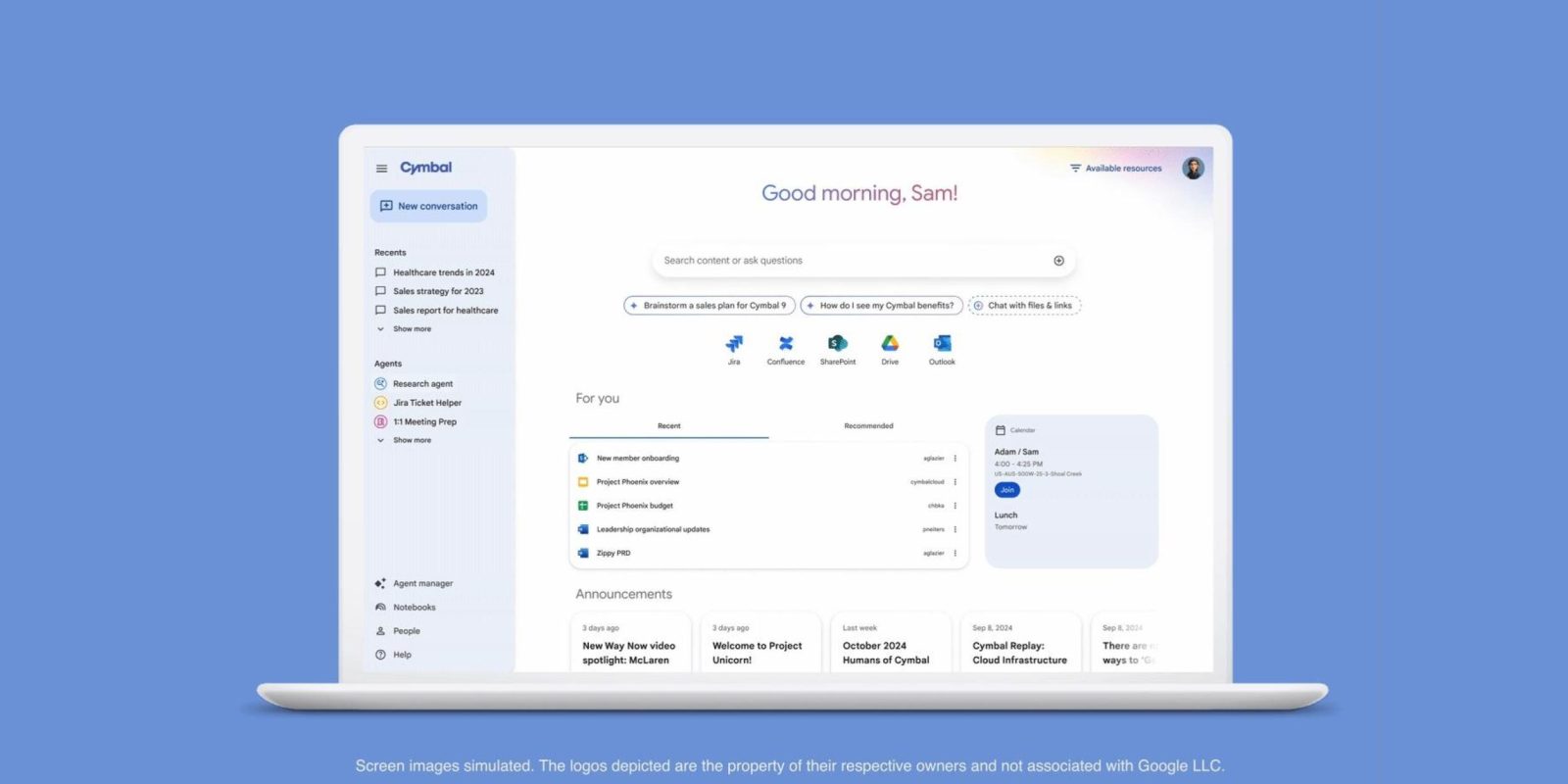 Announced by Google Cloud today, it gives enterprises a “company-branded multimodal search agent,” complete with a homepage that’s a mix of the Gemini and/or Google Chat sidebar and the Google Drive “Home” view with recent files, Calendar widget, and corporate announcements. There’s also a mobile interface. You’re prompted to “Search content or ask questions.”