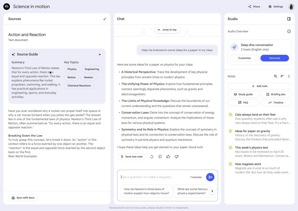NotebookLM is getting a three-column design that “fluidly adapts to your needs,” starting with a “Sources” panel that you can shrink down to a navigation rail or expand to view your document. The middle “Chat” panel is the conversation AI interface to task questions and view responses. Finally, the “Studio “ panel lets you access the Audio Overview, Study Guide, Briefing Doc, notes, and more. The goal of this redesign is to make it “easier than ever to switch between those different activities in a single, unified interface.”