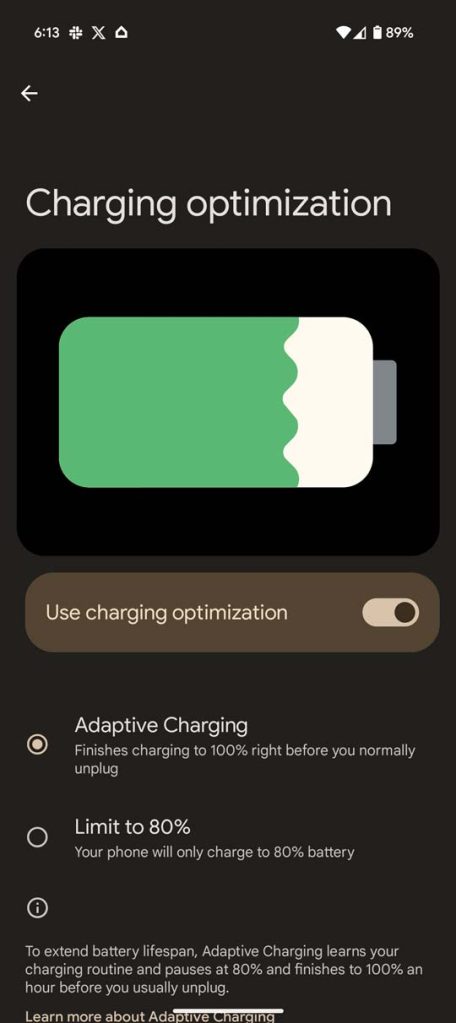 Adaptive charging will charge to 100%, but only right before you usually unplug the device. The limit feature is there as an end-all solution and will never allow your device to charge past that set percentage in order to save the Pixel’s battery over a long period of time. Of course, you can always undo the feature.