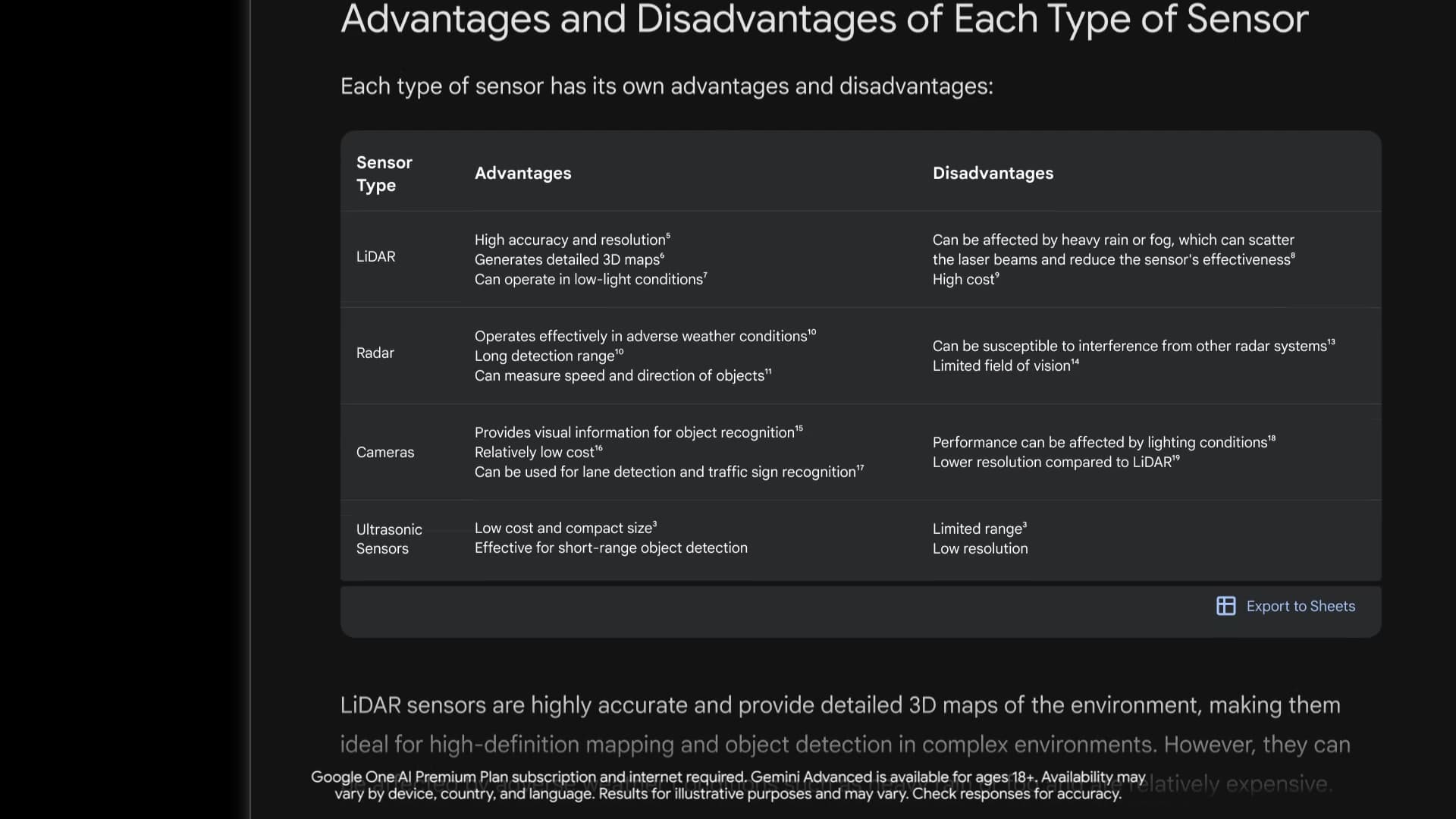 The end result is a “comprehensive report of the key findings” that’s organized into sections/headings. Gemini will note “Sources and related content,” as well as link to “Researched websites.” You’ll find “helpful, easy-to-read insights” and a conclusion, with the ability to export to Google Docs.