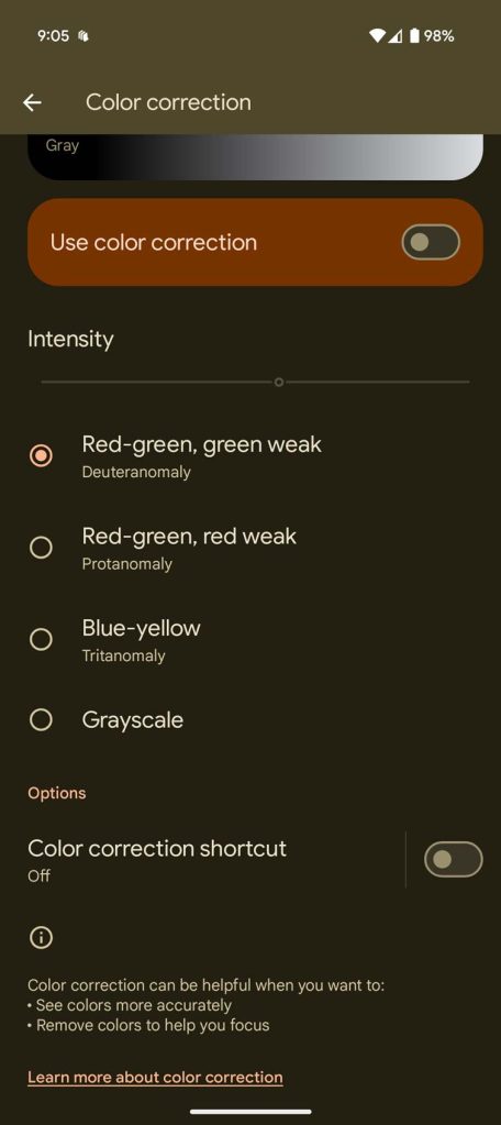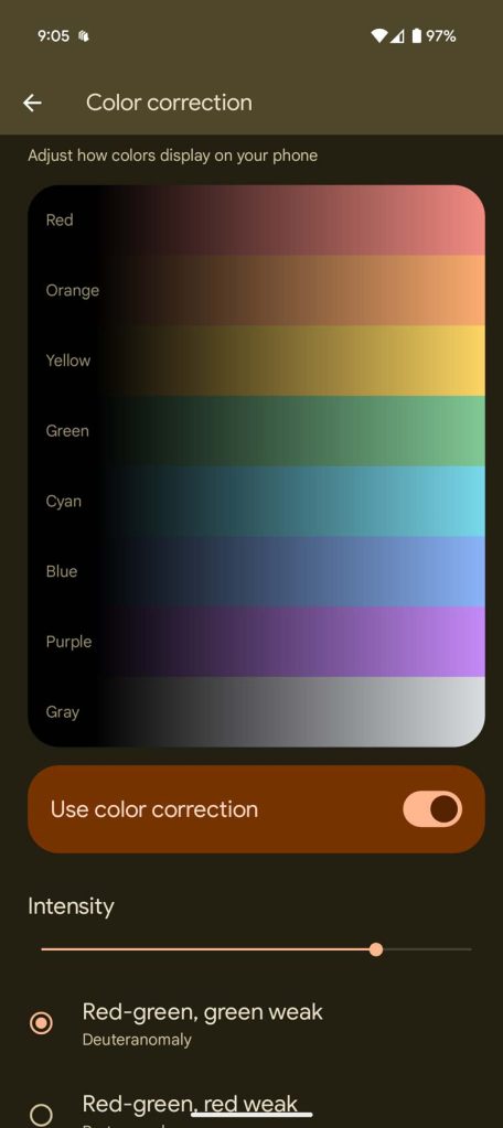 In the latest Android update, the color correction tool now comes with an intensity slider on Pixel devices. Instead of simply offering the user a choice between scales, they can now adjust how strong the representation of colors is on the display itself. The less intense, the more it looks like the base color scale. The higher the slider goes, the stronger the colors shift into that set of colors.