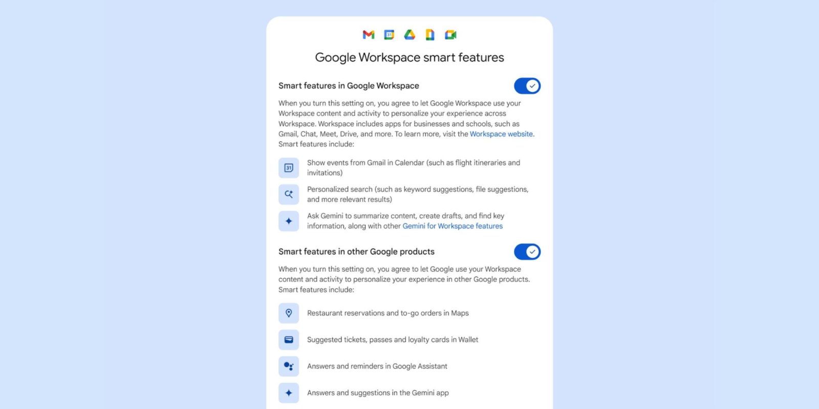 “Smart features in other Google products” allows Maps, Wallet, Gemini, and Assistant to use your Workspace content. For example: