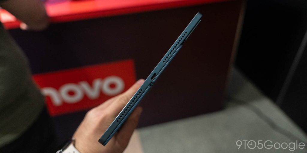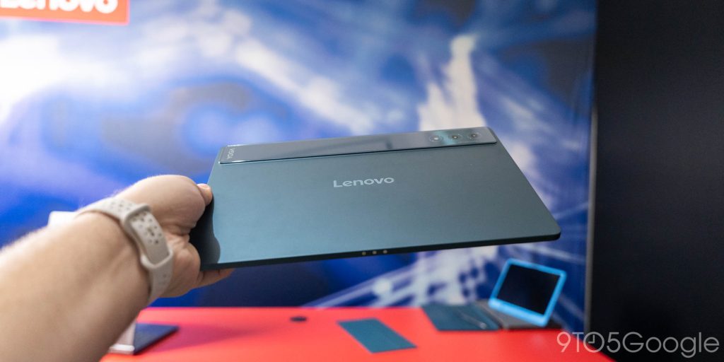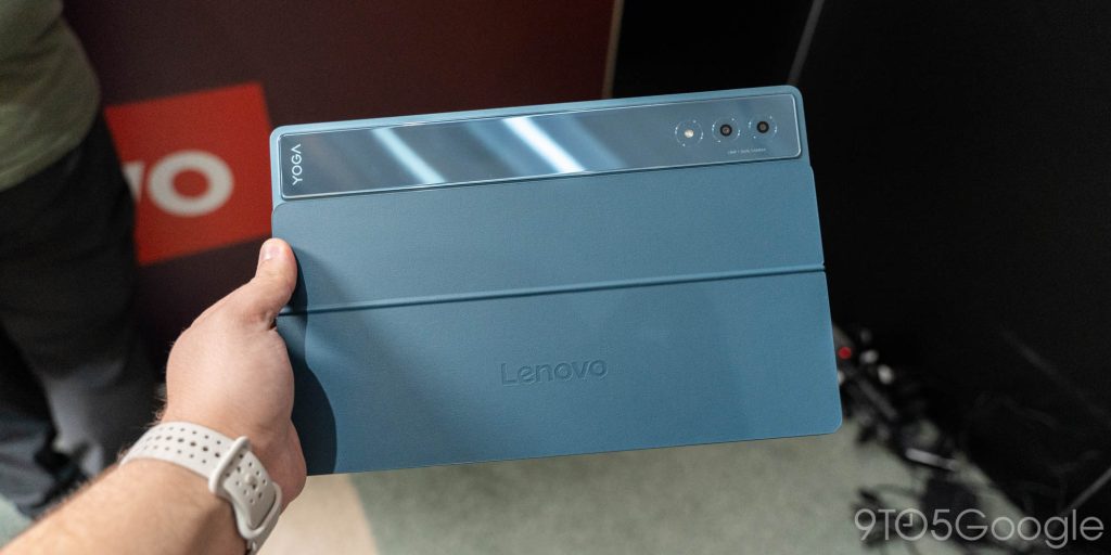 Starting with the flagship, the new Lenovo Yoga Tab Plus is a $699 Android tablet with a 12.7-inch anti-reflective 144Hz display, Snapdragon 8 Gen 3, and a focus on AI features that work on-device. The Yoga Tab Plus puts out a great showing in terms of hardware, with flashy design that includes a reflective glass bar around the back, giving classic Pixel vibes and also matching the Yoga Slim 9i that also launched at the show. It has a magnetic kickstand that fits underneath the bar, and the tablet as a whole is super thin too.