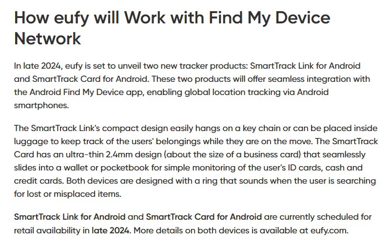 Eufy still references the Find My Device network on a support page, but has never released product pages for “SmartTrack for Android” trackers. Eufy still sells trackers for iOS’ Find My network.