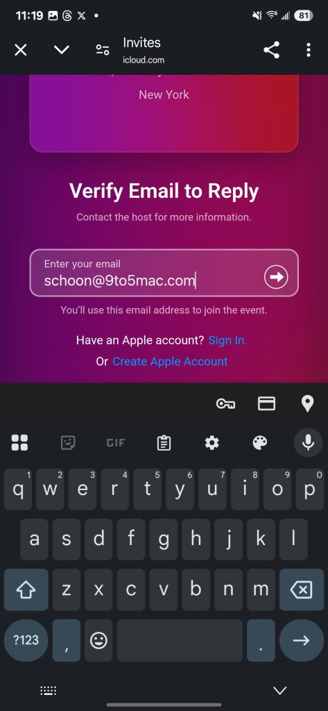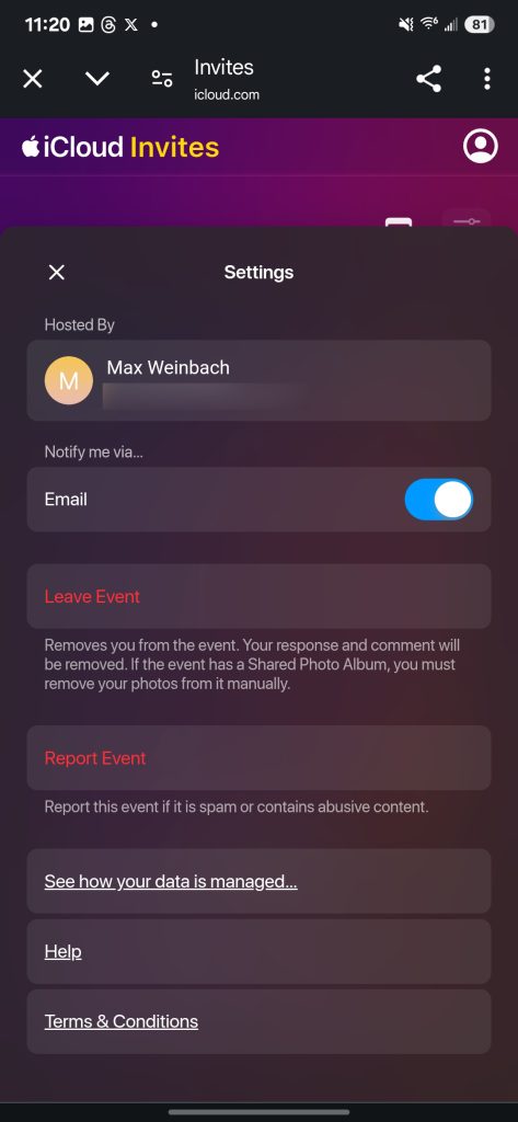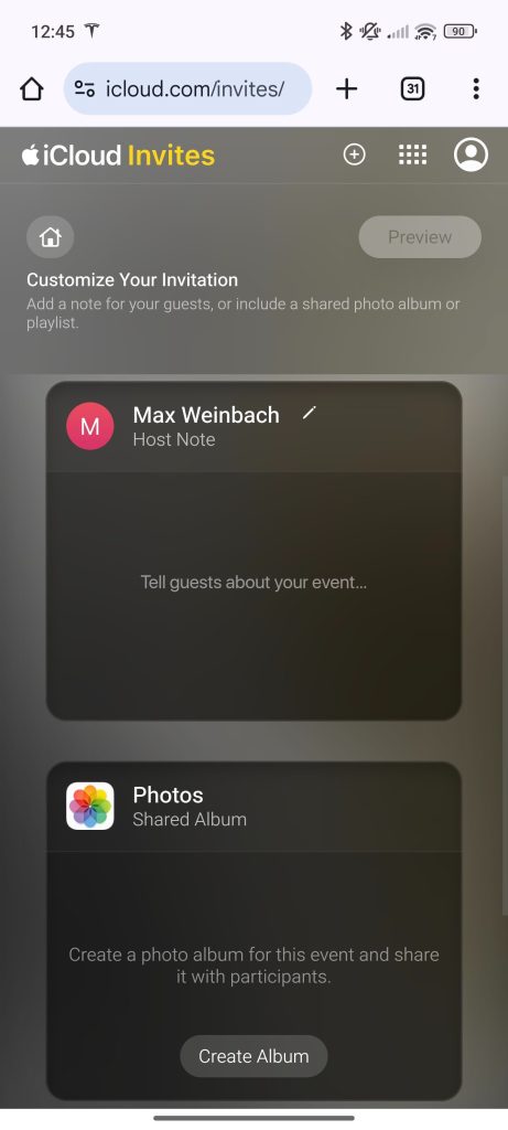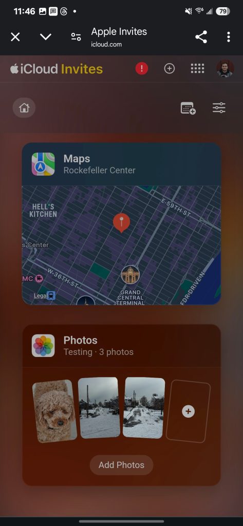 Another drawback is that you can’t use or even view photos without an iCloud account. Photo sharing is perhaps the biggest draw of Apple Invites over alternatives, so this is a bit of a frustrating hurdle for those who aren’t using an iPhone. If you are signed in, you can both see and add photos to the event’s album. Those images don’t need to be backed up to iCloud and can just be uploaded from your Android phone’s file picker. iCloud accounts are free, though, and you won’t need an iCloud subscription to add photos to the event, either. It’s a little annoying, but it’s nothing you wouldn’t see if Google or really any other company were doing the same thing.