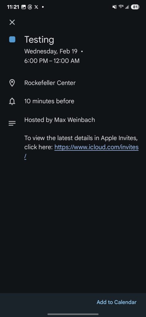 Of course, you won’t leave this webpage open forever. Since there’s no Apple Invites app on Android, you’ll instead have the option to download the calendar event file and add it to the calendar app of your choice. This works well enough, but we noticed that the iCloud invites link in the event is entirely generic, where if you save an event to Apple’s Calendar app on iOS, you get a direct link to this specific event. This doesn’t change if you’re signed into an iCloud account.