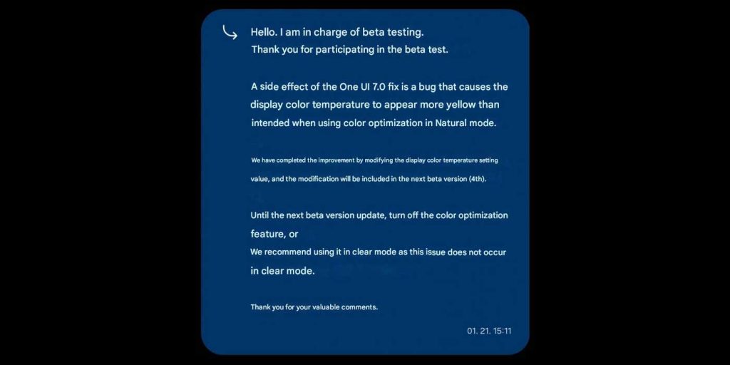 The image included in the photo is a screenshot of a reply from a beta testing admin. The message addresses a bug in One UI 7 that turns the screen yellow in the wrong color mode. The admin indicates that it will be fixed in beta 4, which means there’s likely to be at least one more beta version before the full one.