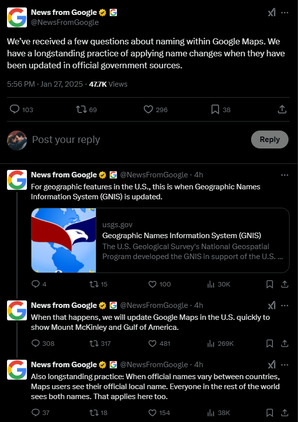 In a statement on Twitter/X, Google confirmed that it will comply with the order as a part of its “longstanding” practice on the matter. Google says that location names in Maps are based on official government sources, which would come from the GNIS in the United States. When “Mount McKinley” and “Gulf of America” are updated in the GNIS, they’ll also be updated in Google Maps.