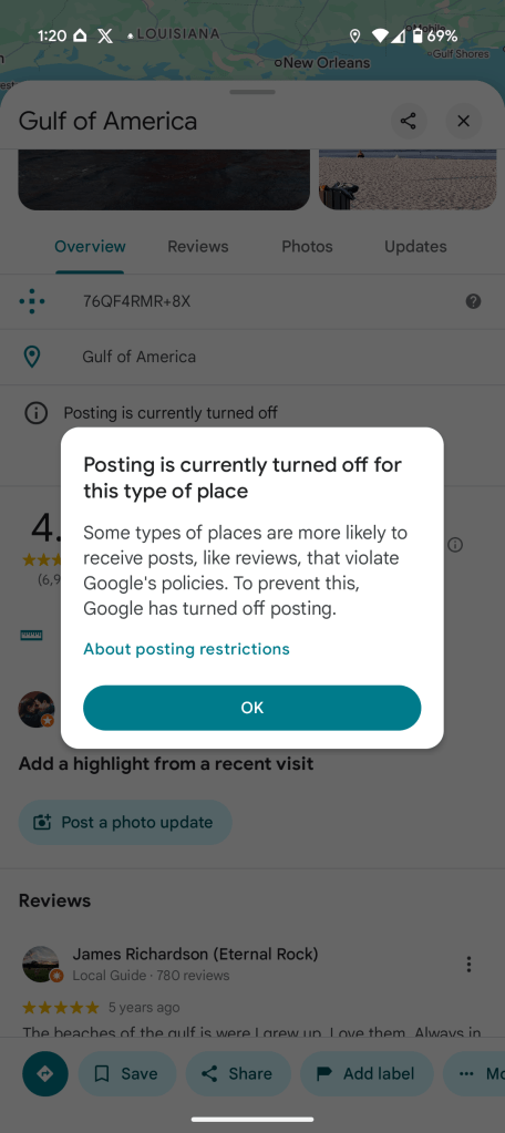 Amid backlash for updating its maps to show “Gulf of America” in place of “Gulf of Mexico,” Google Maps has started to both block new reviews of the location, as well as deleting recent negative reviews.