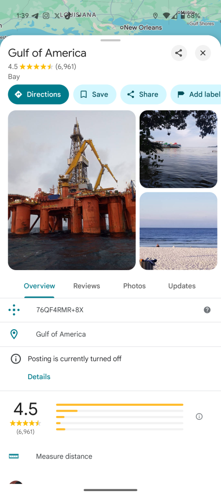 Google has since disabled the ability to leave new reviews of the “Gulf of America” on Maps, with a message appearing saying that “Posting is currently turned off.”