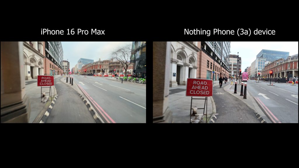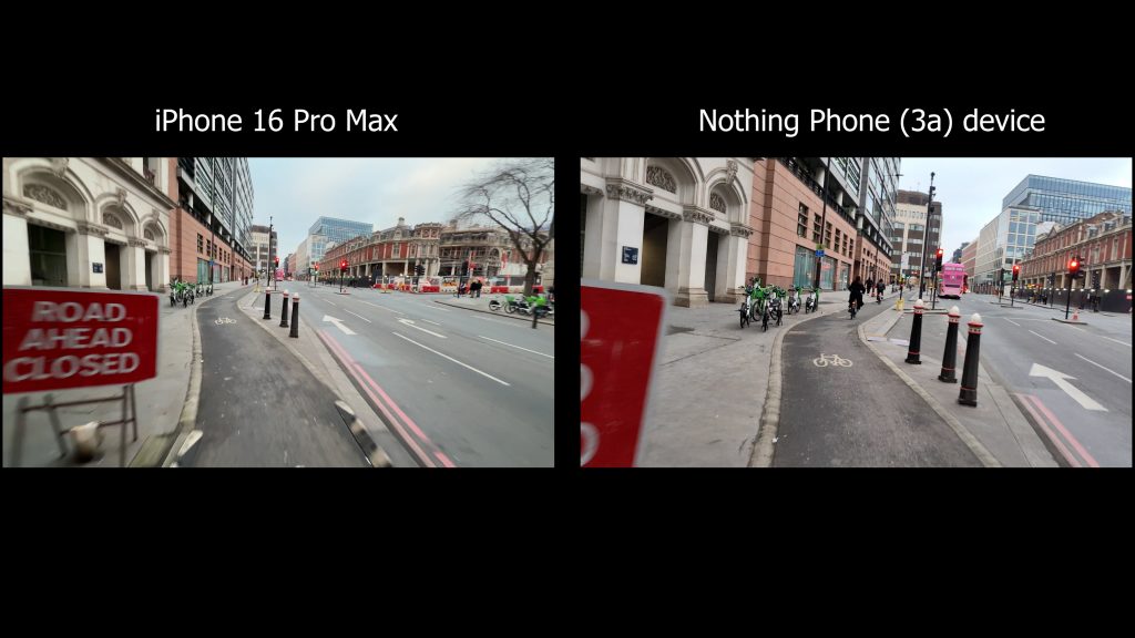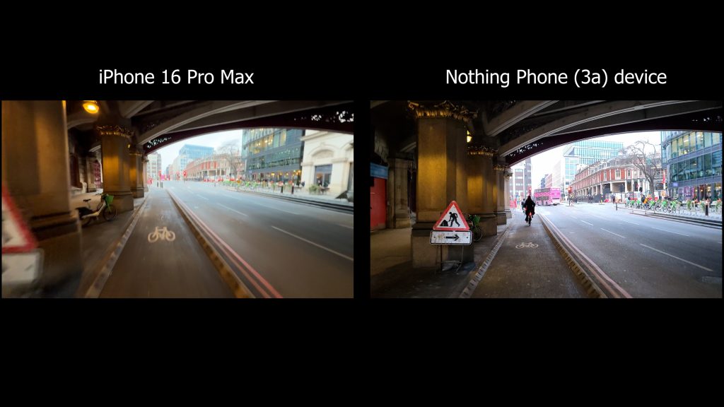 As some comments on Nothing’s video (as well as our own comments section) pointed out, the iPhone was shooting its video clip – of a scene under a bridge while riding a bike – with its ultrawide lens, while the Nothing Phone (3a) series device was shooting with a standard lens. This isn’t easy to see in the very quick clips shared in the video, but Nothing shared the full samples and, in the uncropped video, it’s clear to see that the iPhone is using its ultrawide lens to record. The ultrawide lens on iPhone is typically considered one of the worst for video quality, which led to the shaky, noisy clip in the camera comparison.