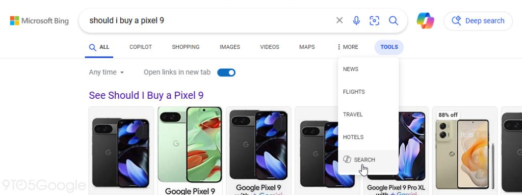 We found that this is live on our account in the United States, with “Copilot Search” appearing in an overflow menu alongside other search filters. The new interface has also been shown to be available without clicking on this additional tab, though.