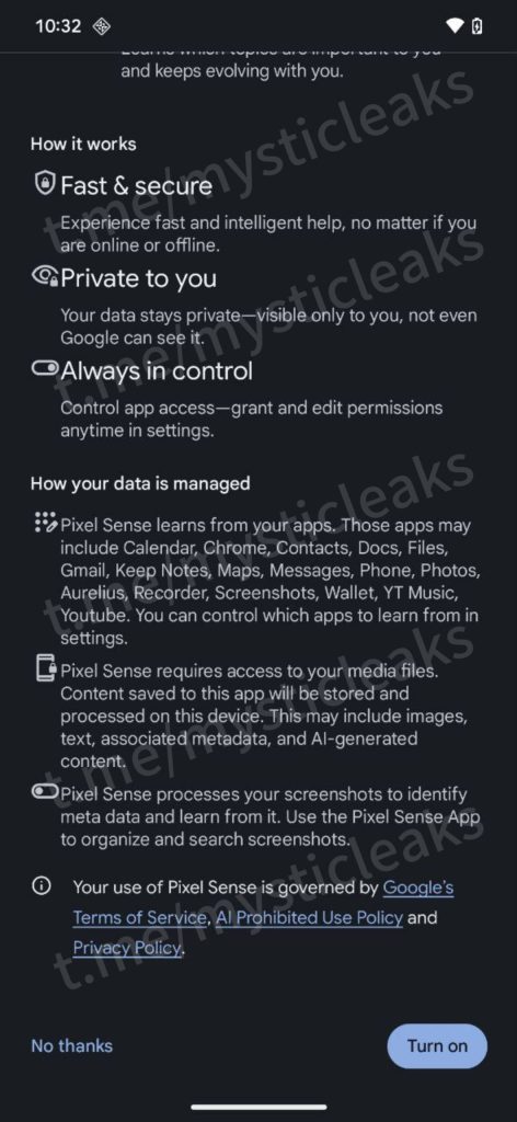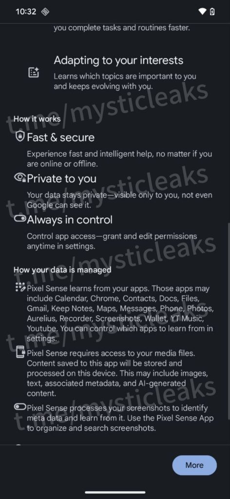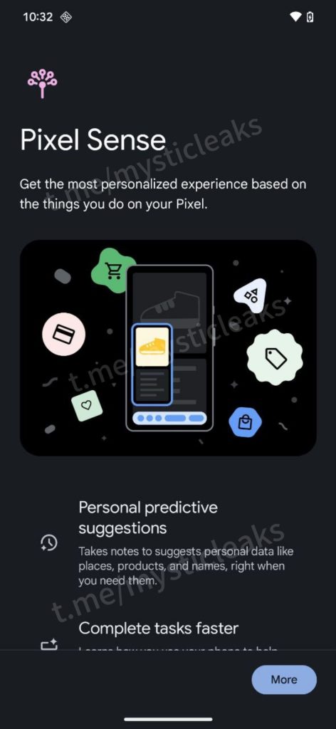A report from Android Authority has claims that assistant is “Pixel Sense,” citing a “source inside Google.” while screenshots of the setup for this new feature were shared in a “Mystic Leaks” Telegram group. Google describes the featuring saying that it delivers “the most personalized experience based on the things you do on your Pixel.”
