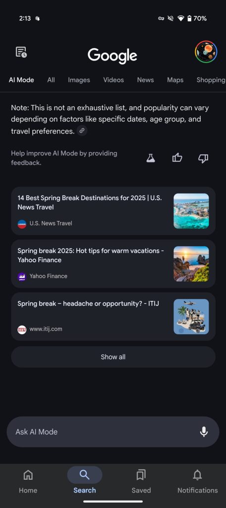 On the web, you can also access AI Mode directly from google.com/aimode. This takes you to a chatbot-esque UI with an “Ask AI Mode” text field. One really delightful touch is how the text cursor cycles through the four Google colors. (This is also the case on Android and iOS.)