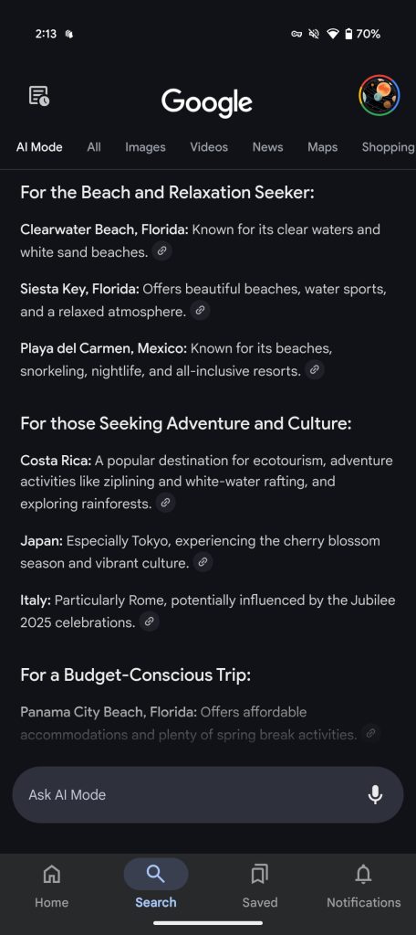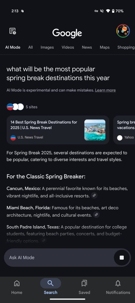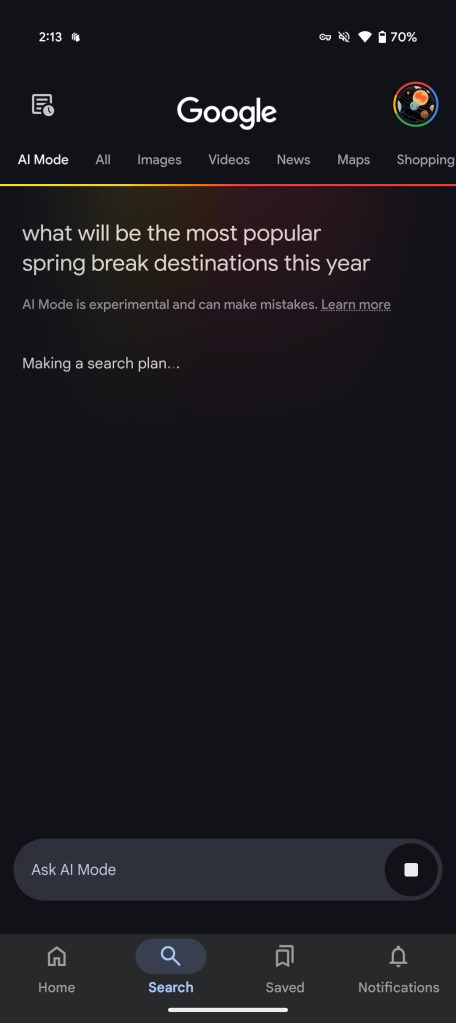 On the web, you can also access AI Mode directly from google.com/aimode. This takes you to a chatbot-esque UI with an “Ask AI Mode” text field. One really delightful touch is how the text cursor cycles through the four Google colors. (This is also the case on Android and iOS.)