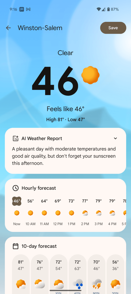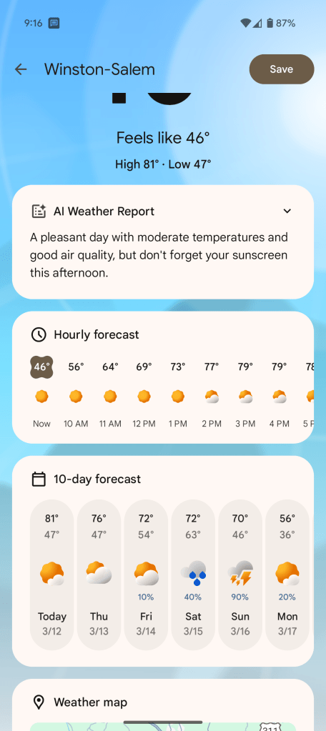 Beyond that, when viewing the weather in your current location, a new “Save” button appears which allows you to save that location to the app’s homepage. Previously, you would have to manually search for that location to add it to the “Saved Locations” list.
