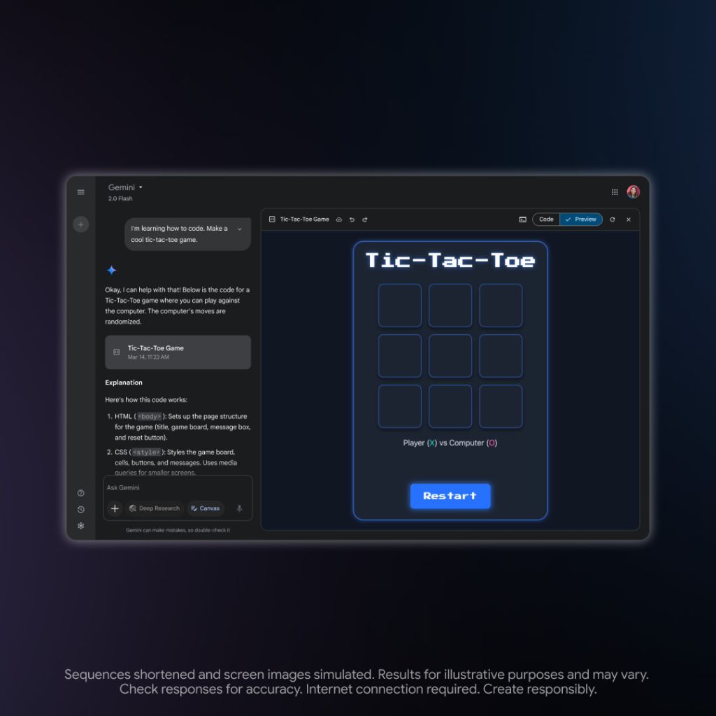 You can also use Canvas for coding, with Gemini able to “generate and preview your HTML/React code and other web app prototypes to see a visual representation of your design.” These code previews are available on the Gemini web app.