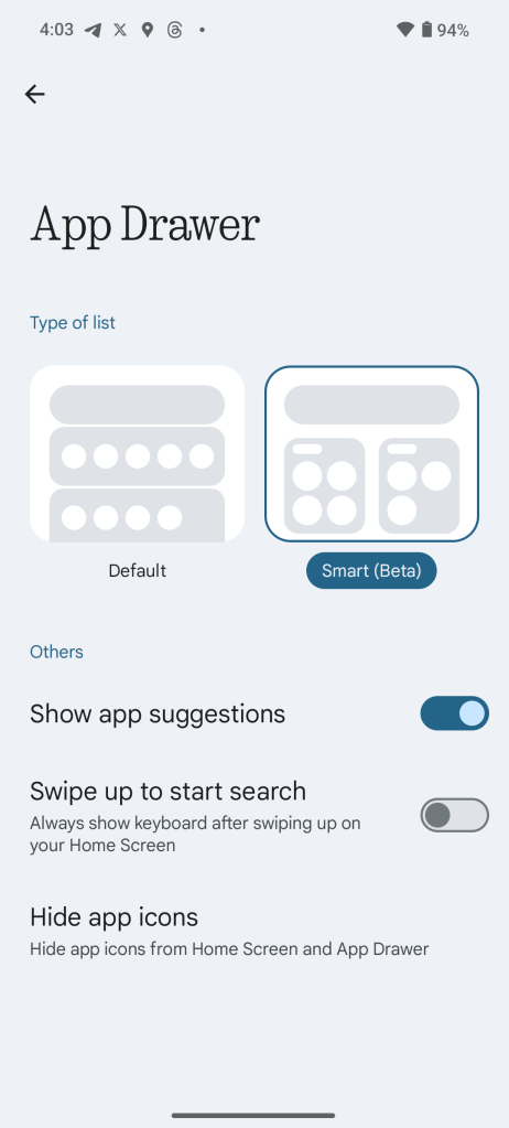 Nothing is trying some new ideas as of late, and some are good. The revamped Quick Settings with resizeable tiles are excellent. But the new “Smart” app drawer layout is just a carbon copy of one of the worst aspects of iOS, the “App Library.” I’m glad it’s not the default, but I’m not sure I like the idea of Nothing just pulling ideas (and bad ones at that) from others. This is a brand I’ve come to appreciate largely because it tends to find unique solutions and interesting takes on features.