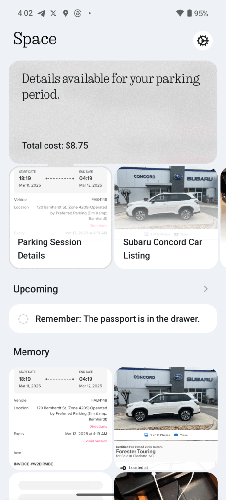 I think that’s largely because it’s not very predictable. Like many AI features, Essential Space is open-ended, promising to do… something with whatever you give it. As such, it takes a while to find any actual use case for the app. The best use case I’ve found thus far was one I just randomly stumbled into. While attending a concert I purchased parking time, and take a screenshot with Essential Space of the receipt and the time allotment. That was more so I’d have something easy to find later, as Essential Space screenshots are separate from regular ones, but what I was happy to see what several hours later when I got a reminder that the parking time was ending. That’s really useful!