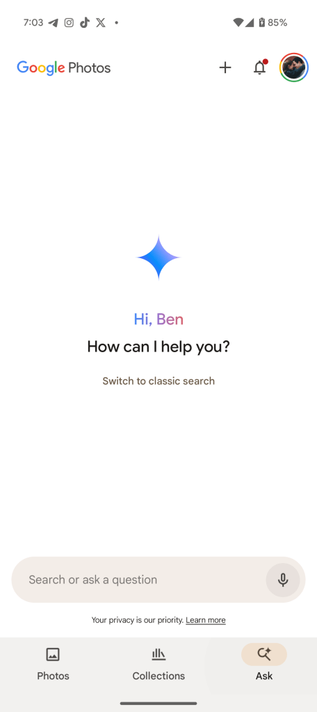 A test earlier this year toyed around with deprioritizing “Ask Photos” on the Search tab, but the majority of users are still seeing the UI that defaults to “Ask Photos” and has a small button to “Switch to classic search.”
