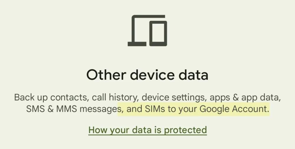 This is very likely referring to eSIM rather than a physical SIM card, but the utility here is obvious. Google is already working to make it easier to transfer an eSIM between devices, and the ability to back that SIM up would just make things all the more painless when restoring from a device you no longer have access to.