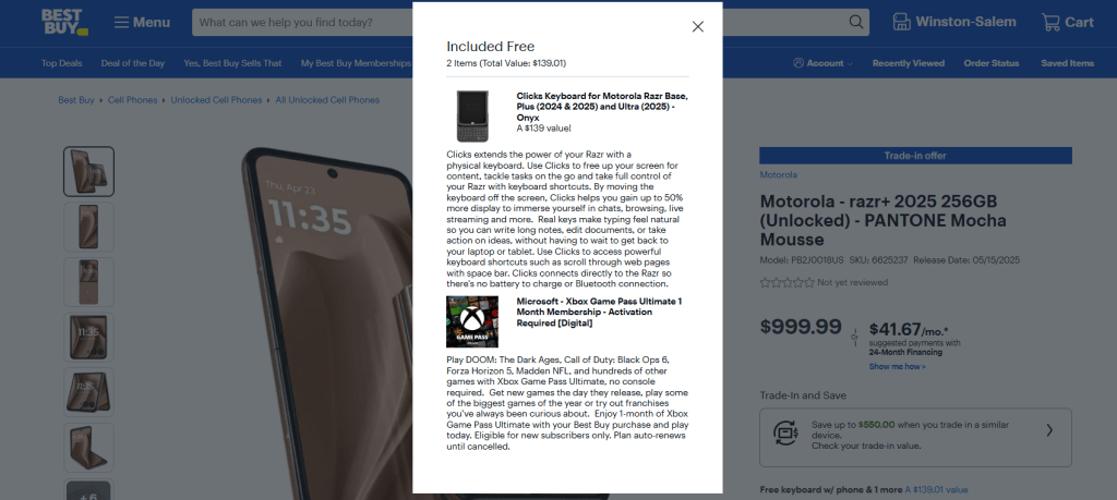Best Buy might by the best buy of the bunch, though. The retailer has partnered with Clicks to include a free keyboard case with all Razr (2025) orders through June 1, as announced by Clicks co-founder Jeff Gadway on LinkedIn. The promo includes the $140 case with all three variants of the device, with the Razr Ultra’s case also being a new addition to the Clicks lineup. The keyboard accessory launched in 2023 for iPhone and has since expanded to Google’s Pixel 9 and 9 Pro, Motorola Razr (2024), and will also be coming to the Galaxy S25 later this year.