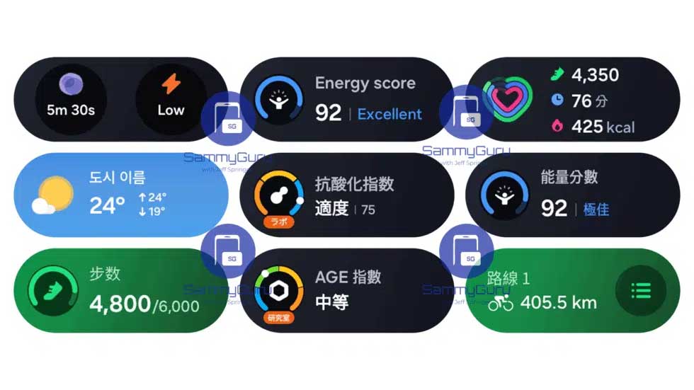 The next set of tiles is where it gets interesting. These tiles look more like pills in the UI than anything. According to the source, these are half-size tiles, indicating that they may only take up half of the Galaxy Watch’s display. That would also suggest another tile could be placed above or below it, but there’s no telling how Samsung wants to implement this design element from the images.