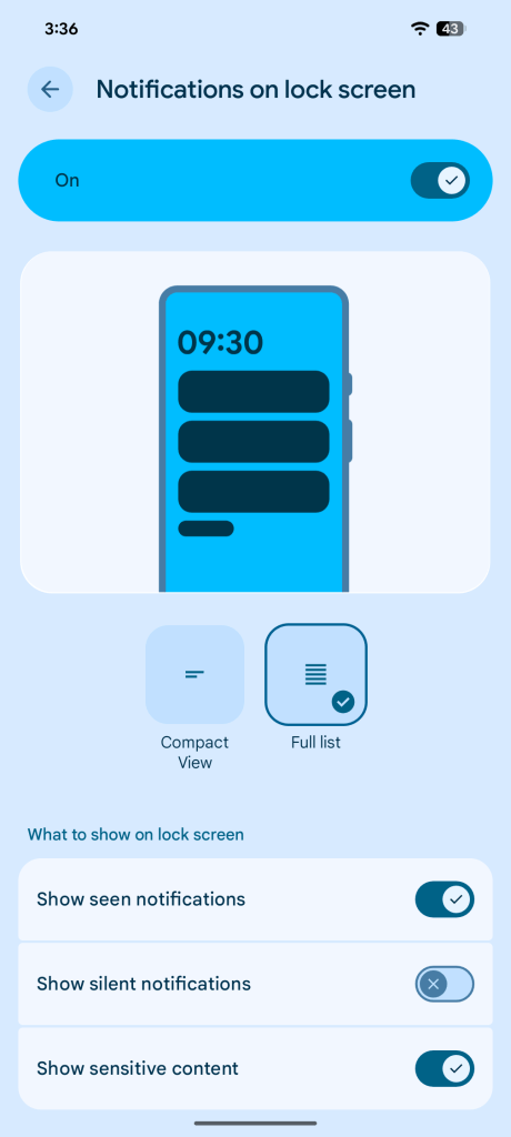 Beyond that, the lock screen is getting a new layout option for notifications. By default, the lock screen shows just one notification with minimized icons for further notifications below that. This is called the “Compact view,” where a new “Full list” option will show multiple notifications and then drop the rest into an overflow with icons.